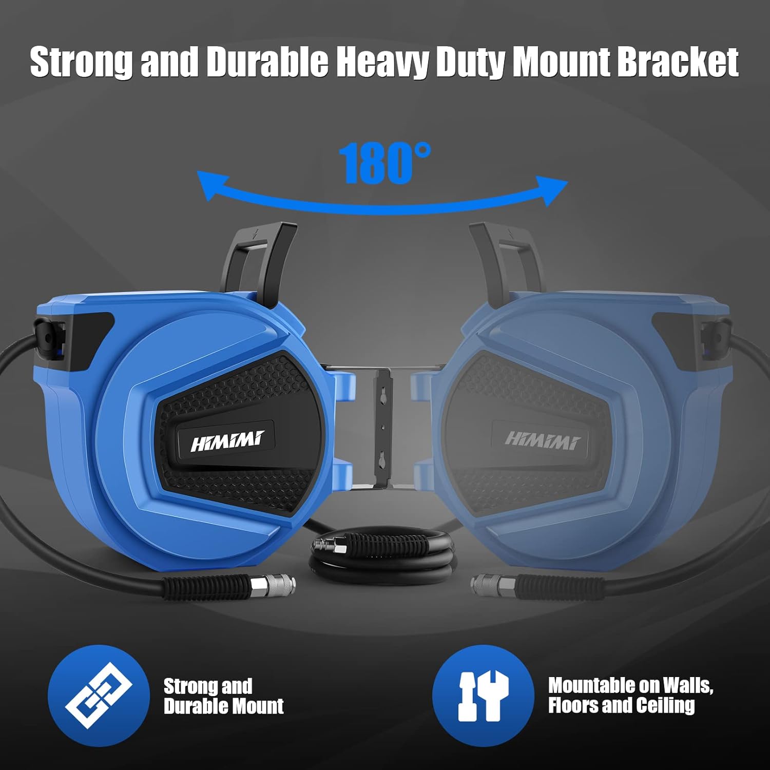 - 【Easy to Install with 180° Swivel Steel Bracket】1) The pneumatic hose reel is easy to mount on wall and ceiling. Easy to organize your air hose and save floor space! 2)Mounting bracket is made of quality steel, stronger and more durable than plastic. It can rotate 180° horizontally, it is easy to pull the air hose from any corner of your workshop.