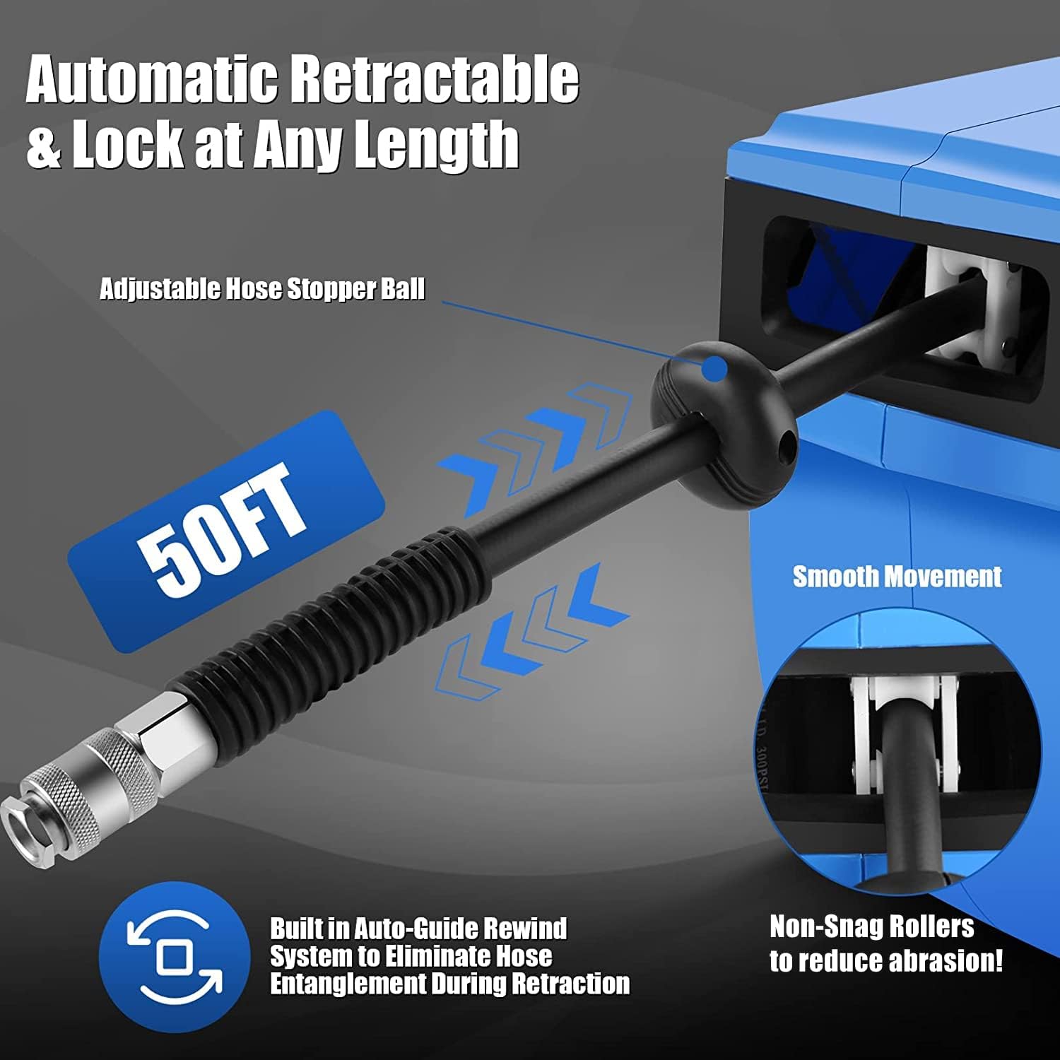 - 【Lock to any desired length and adjustable hose stop】 This compressed air hose reel adopts a release ratchet spring to automatically lock the air hose at any desired length. Designed with an adjustable hose stop to keep the air hose always within reach. 2 anti-snag rollers to reduce abrasion and hose wear.