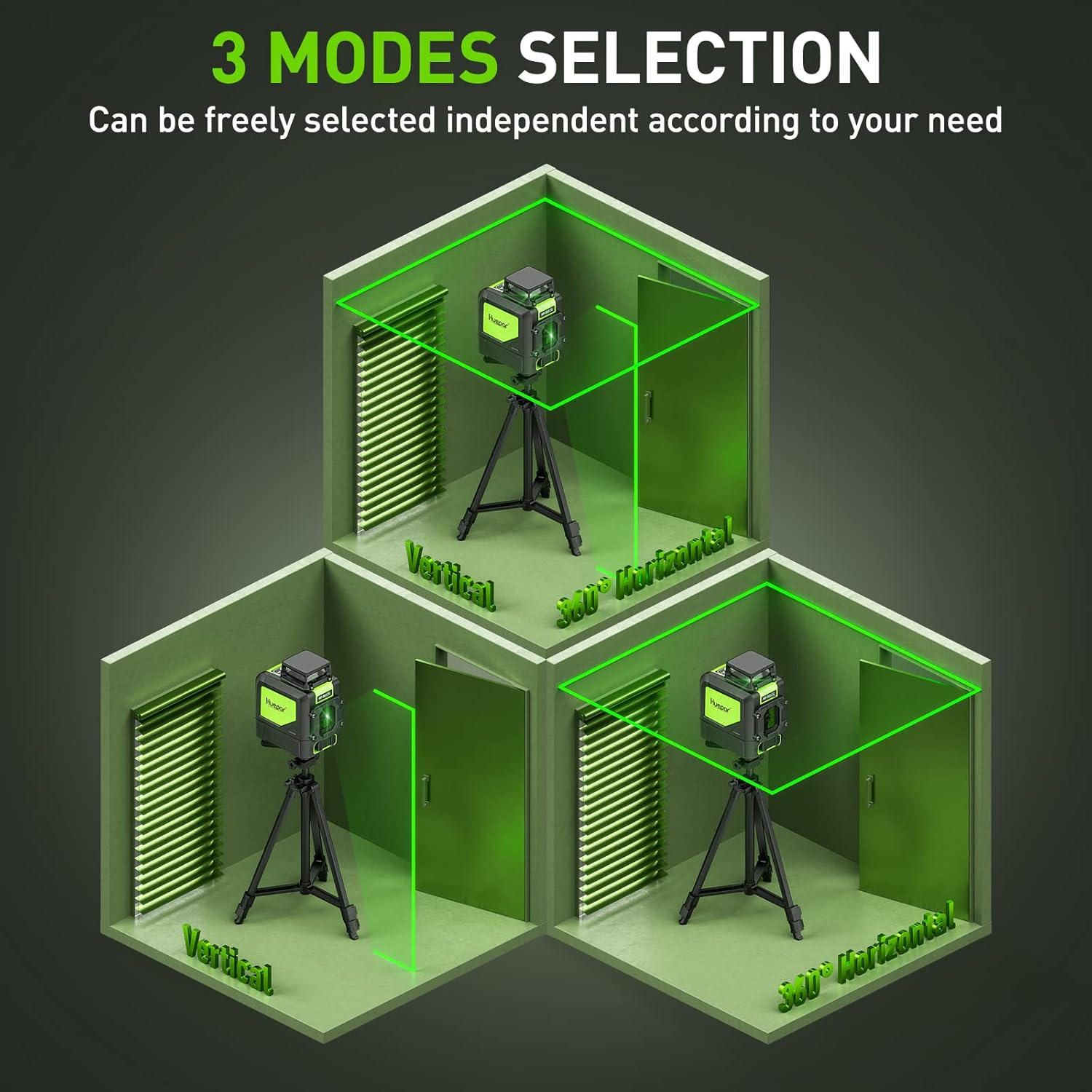 - 360-DEGREE HORIZONTAL LINE - With one ultra-bright 360° horizontal and one 130° vertical green beams provides all-around leveling coverage even in big job-site. The bright 360° horizontal line allows the user to project a laser reference line around the room with accuracy to quickly establish level, enabling users to work in different parts of a room simultaneously.