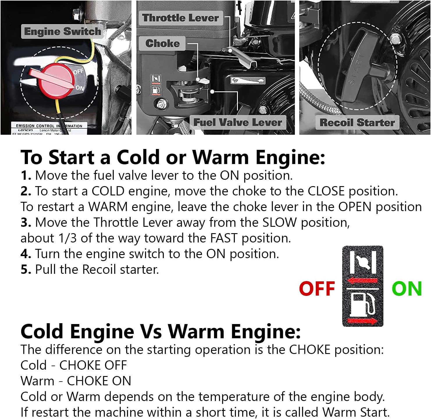 - Engine type : Forced Air -Cooled , 4 -Stroke Gasoline Engine 6.5HP; Max power 4.8KW (6.5HP) (3600RPM)